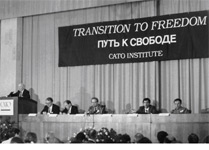 Douglass North (at the podium), speaking at Cato’s 1990 Moscow conference.