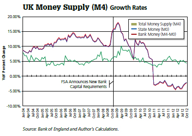 As the accompanying chart shows, the rates of growth for bank money and the total money supply have plummeted since the British Financial Services Authority announced its plan to raise capital adequacy ratios for U.K. Banks.