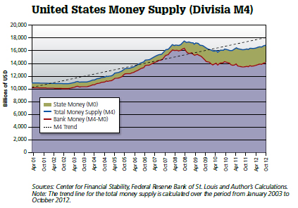 The United States has also employed this loose state money/tight bank money monetary policy mix. With bank money making up 85% of the total U.S. money supply, broadly measured, it should come as no surprise that the U.S. is also registering a money supply deficiency — 6.73% to be exact (see the accompanying chart).