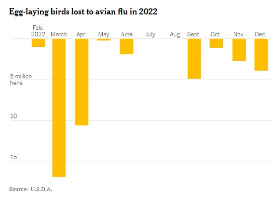 As detailed in a recent piece in The Atlantic, avian flu is particularly brutal for egg-laying chickens, is really difficult to control (wild birds poop it from the sky!), and requires several months of recovery: