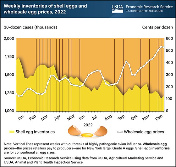 When egg supplies are limited, e.g., flock losses related to avian influenza, but demand remains high, e.g., during the peak holiday egg buying season, wholesale prices are exacerbated. Put simply—egg producers are price takers, not price makers. Egg prices are set by the demand of those who are buying the eggs on the wholesale market.