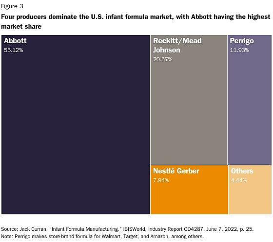 By contrast, in the infant formula market—which really is concentrated (thanks to a lot of federal policy)—just four producers accounted for more than 95 percent of the U.S. market before the crisis hit.