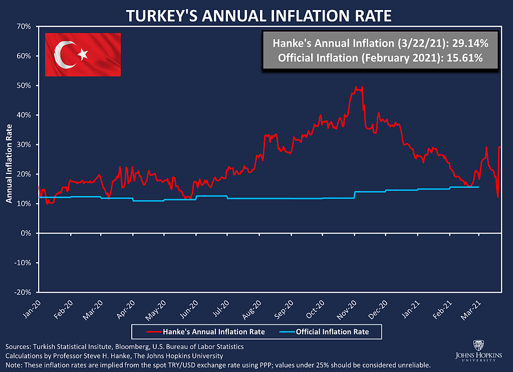 Since Erdogan took over Turkey’s presidential reins in August 2014, the lira has shed 74 percent of its value against the U.S. dollar. And, since the first of this year, the lira has depreciated by 28.5 percent against the greenback. Today, inflation in Turkey is soaring at 29.14 percent per year by my measure. My measurement, which employs high-frequency data and the use of Purchasing Power Parity theory, is nearly double Turkey’s official annual inflation rate of 15.61 percent per year. The charts below depict the collapse of the lira and Turkey’s annual inflation rate since January 1, 2020, respectively.