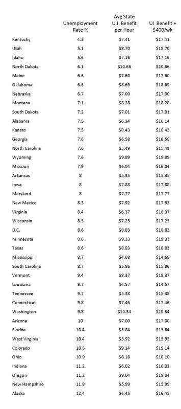 The Table shows all the states ranked top to bottom from the lowest to the highest unemployment rates in June. The last column shows what $400 a week would add to average state UI benefits when weekly benefits are divided by 40 hours to show what hourly wage would be needed to match those benefits.