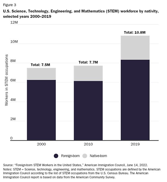 But immigrants aren’t just founding U.S. tech companies; they’re staffing them too. As economist Kimberly Clausing notes in her recent book, for example, “As of 2014, 46 percent of Silicon Valley’s workforce was foreign‐born. The share is even larger for workers between the ages of 25 and 44, and it rises to a whopping 74 percent of workers hired for their math and computer expertise in that age bracket.” Between 2000 and 2019, the U.S. foreign‐born STEM (science, technology, engineering, and mathematics) workforce increased substantially: