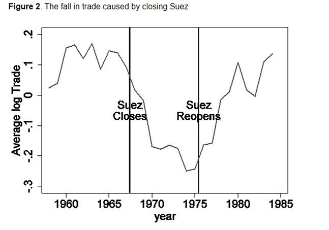 And, third, the decline in total trade (and increase after the canal reopened) had a significant effect on per capita incomes in these same countries—they got poorer when it was closed and richer when it reopened. Thus, “increases in trade volumes generated by decreases in trade costs generate higher income per capita,” with the Suez Canal being a substantial “trade-cost-decreaser” (just go with it). Elsewhere, Freyer adds that his results “suggest that every dollar of increased trade raises income by about twenty-five cents” and “provide clear evidence that lowering trade barriers leads to higher trade volumes and higher incomes.” Again, he shows that the canal (and other major man-made waterways like the Panama Canal) are just like much-maligned tariff liberalization in that regard.