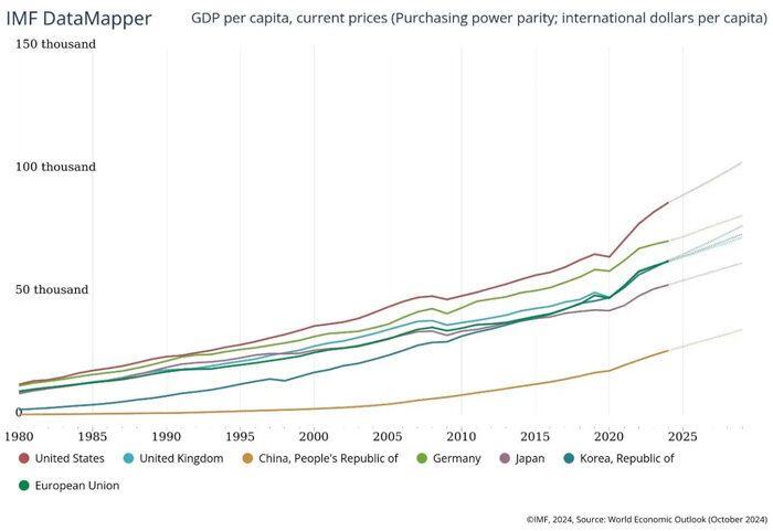 IMF estimates aren’t everything, of course, but they’re useful to show long-term, high-level economic trends, and here we can see that—for the last several decades and maybe for at least one more—it’s been the United States first and everyone else second: