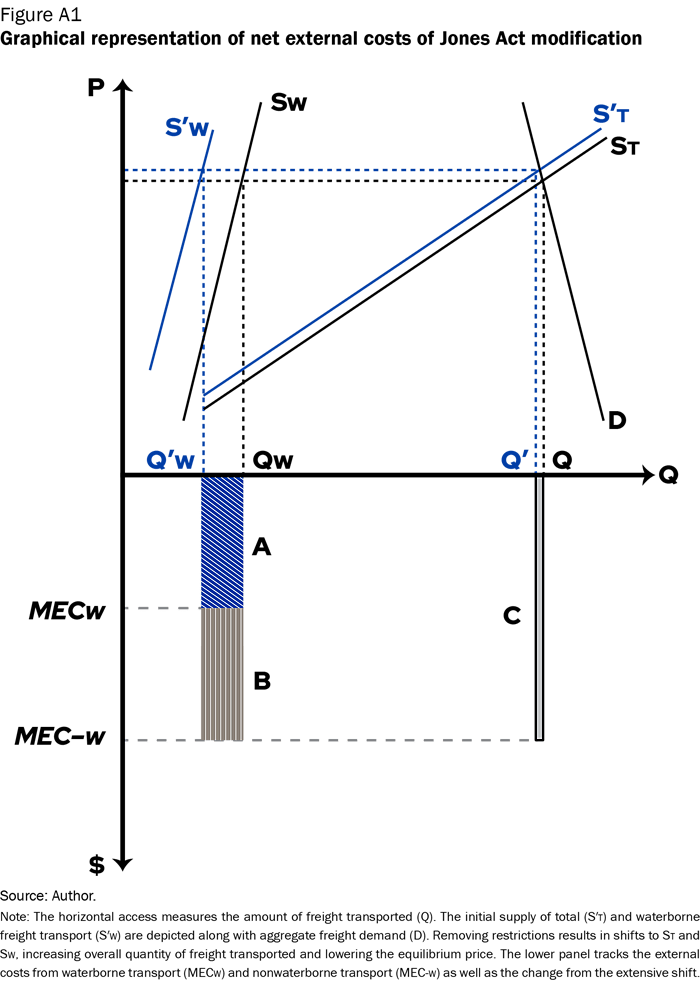 Accounting for the external costs of the Jones Act requires a second consideration: the Jones Act’s effect in the transport market. The top panel of Figure A1 represents the Jones Act as a supply shifter for the waterborne transport sector. Because waterborne transport is small relative to the total transport industry, and the Jones Act does not affect the supply of other modes of transport, the overall shift is smaller. Holding demand constant, the net effect is a reduction in overall transport from Q to Q′, and a corresponding private cost increase. The magnitude of these shifts depends on the price elasticity of demand and the aggregate supply elasticity. Under this specification the market share of waterborne transport decreases from QW/Q to Q′W/Q′. This is a short-run change. In the long run, the elasticity of supply in the waterborne sector is likely to decrease because of barriers to entry and lower capital investment attributable to smaller quasi-rents.