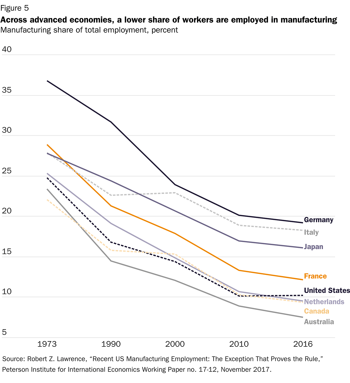 Further confirmation is provided by similar data from other advanced economies—including ones with persistent trade surpluses and active labor and industrial policies. Manufacturing’s share of employment nearly halved in Germany from 1973 to 2016 while Australia witnessed a two-thirds reduction over the same period. Manufacturing’s reduced share of employment isn’t particular to the United States but rather reflects a broader international phenomenon (Figure 5).