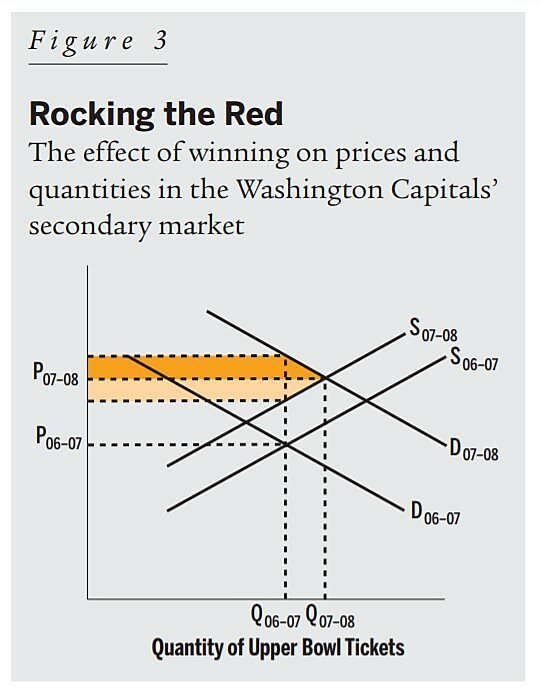 Figure 3 illustrates my interpretation of the results for upper bowl seats. The Caps’ improved play increased the demand for upper bowl seats in 2007-08, but also increased the opportunity cost of selling them, since sellers were giving up the opportunity to see better games.