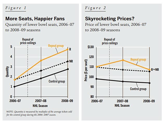 The effect of repealing price ceilings is an empirical issue, one that cannot be resolved by the application of economic theory alone. In this article, I estimate how the repeal of price ceilings by Minnesota, Missouri, New York, and Pennsylvania affected the prices and quantities of National Hockey League tickets exchanged on Stubhub, which is the leading online marketplace for reselling tickets. I chose professional hockey for three reasons: First, I wanted to focus on some sort of entertainment event — concerts, plays, or games — that occurred both before and after the states repealed their price ceilings. Professional hockey games were attractive because Minnesota, Missouri, New York, and Pennsylvania repealed their price ceilings between the 2006-07 and 2007-08 NHL seasons. Second, I wanted to choose entertainment events that allowed me to compare changes in ticket prices (and quantities) in repeal states with those occurring in states that did not change their laws. Professional hockey scored again because there are seven professional hockey teams in repeal states and 15 in states that did not change their laws over the three seasons that I examined. Finally, I wanted to choose a type of entertainment event for which the criteria of selection into the sample would be obvious, such as all of the American teams of the NHL. This should reassure readers that the results are not being driven by the selection of the sample, i.e., that I did not cook the books by cherry-picking the sample.