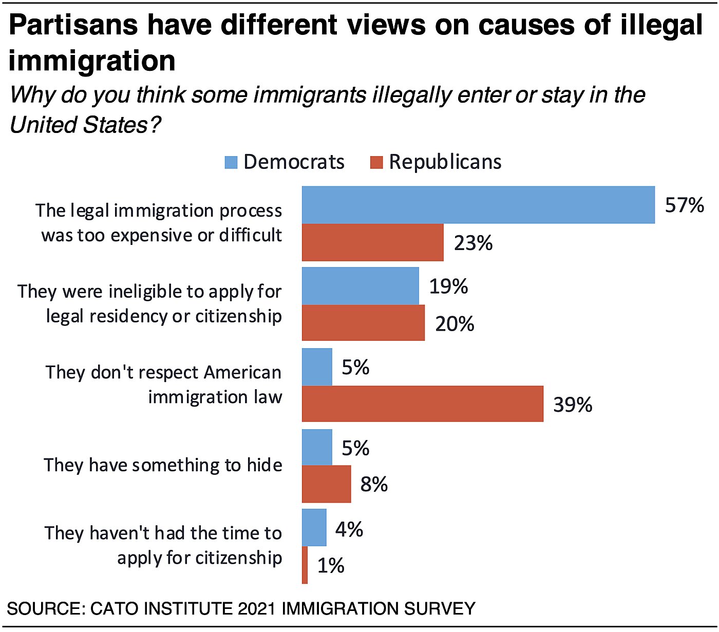 Partisans have different perceptions. Republicans are more likely than Democrats to attribute illegal immigration to nefarious motives. For instance, a plurality (39%) of Republicans thinks some immigrants illegally enter or stay in the U.S. because “they don’t respect American immigration law” compared to 5% of Democrats. Instead, 57% of Democrats think illegal immigration is due to an expensive and difficult legal process, compared to 23% of Republicans. Partisans are about equally likely to think it is due to ineligibility (20% Republicans, 19% Democrats).