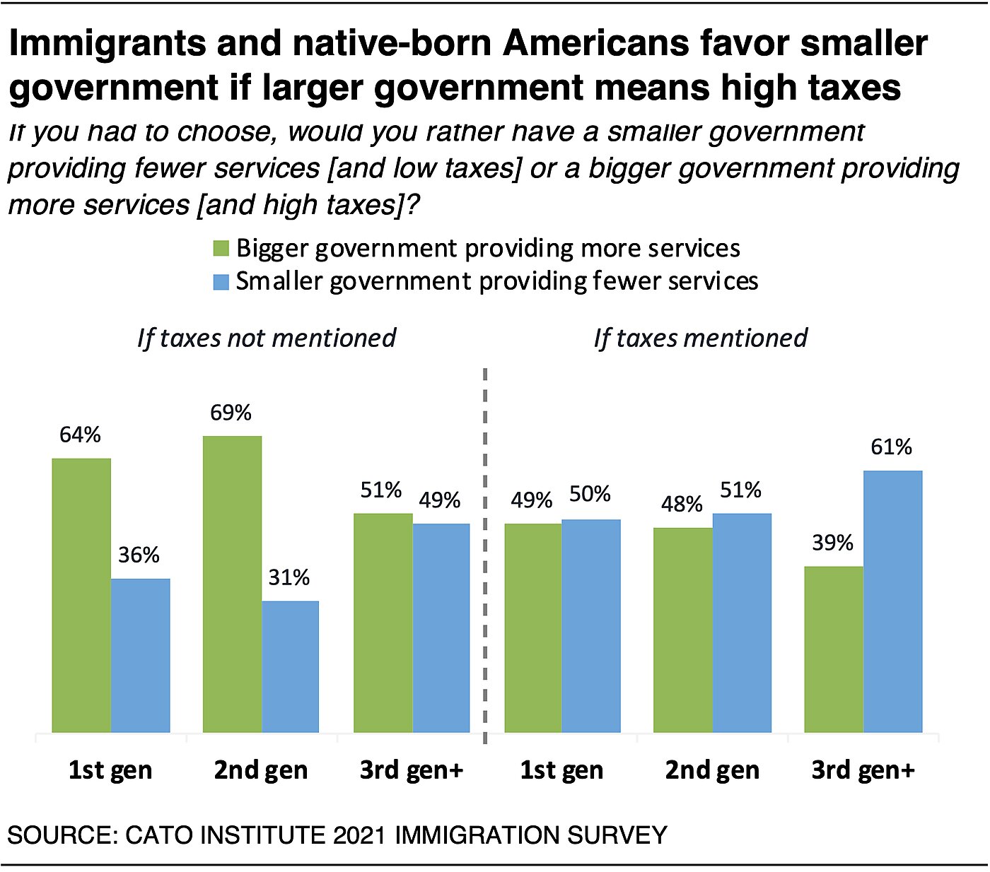 Views change and the gap narrows when taxes are mentioned in the survey question. Survey respondents were split into two groups. The first group was asked if they favor larger or smaller government that provides more or fewer services. The second group was asked this same question, but with tax rates specified: would they prefer a “larger government providing more services and high taxes” or a “smaller government providing fewer services and low taxes”? If larger government requires high taxes, 50% of first-generation, 51% of second-generation, and 61% of the third generation and higher prefer smaller government, fewer government services, and low taxes.