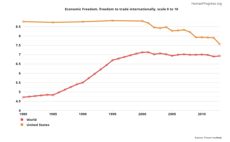 However, the recent trend in the United States is less positive. If trade protectionist politicians, like Bernie Sanders on the left and Donald Trump on the right, have their way, then U.S. freedom to trade internationally may deteriorate further. They put down trade by claiming that it harms the U.S. economy and destroys jobs. Yet, there is a widespread agreement among economists that free trade is key to prosperity. (Learn more about the relationship between increased trade and jobs here).