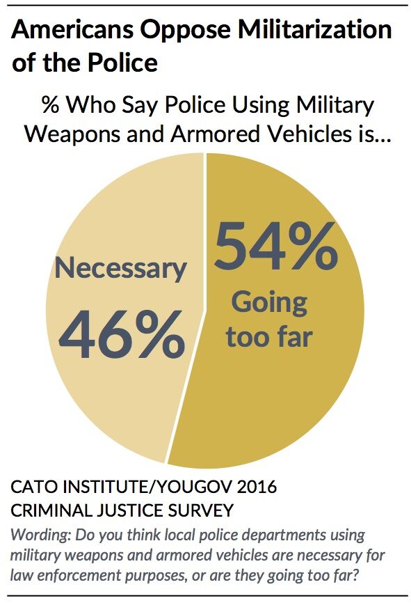 A majority of Americans (54%) say that police departments using military weapons and armored vehicles “goes too far.” Another 46% believe that police using military equipment is “necessary for law enforcement purposes,” according to a new Cato Institute/YouGov survey of 2,000 Americans.