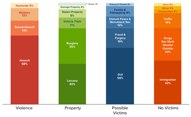 Figure 2 depicts the distribution of convicted immigrants within the four categories—violent crimes, property crimes, crimes with possible victims, and crimes without victims. As I have explained before, most violent crimes were assaults, which include simple assaults defined by the FBI to include assaults “where no weapon was used or no serious or aggravated injury resulted” and include “stalking, intimidation, coercion, and hazing” where no injuries occurred. The FBI excludes simple assault from its definition of violent crime, but ICE fails to break down this category, so we cannot.