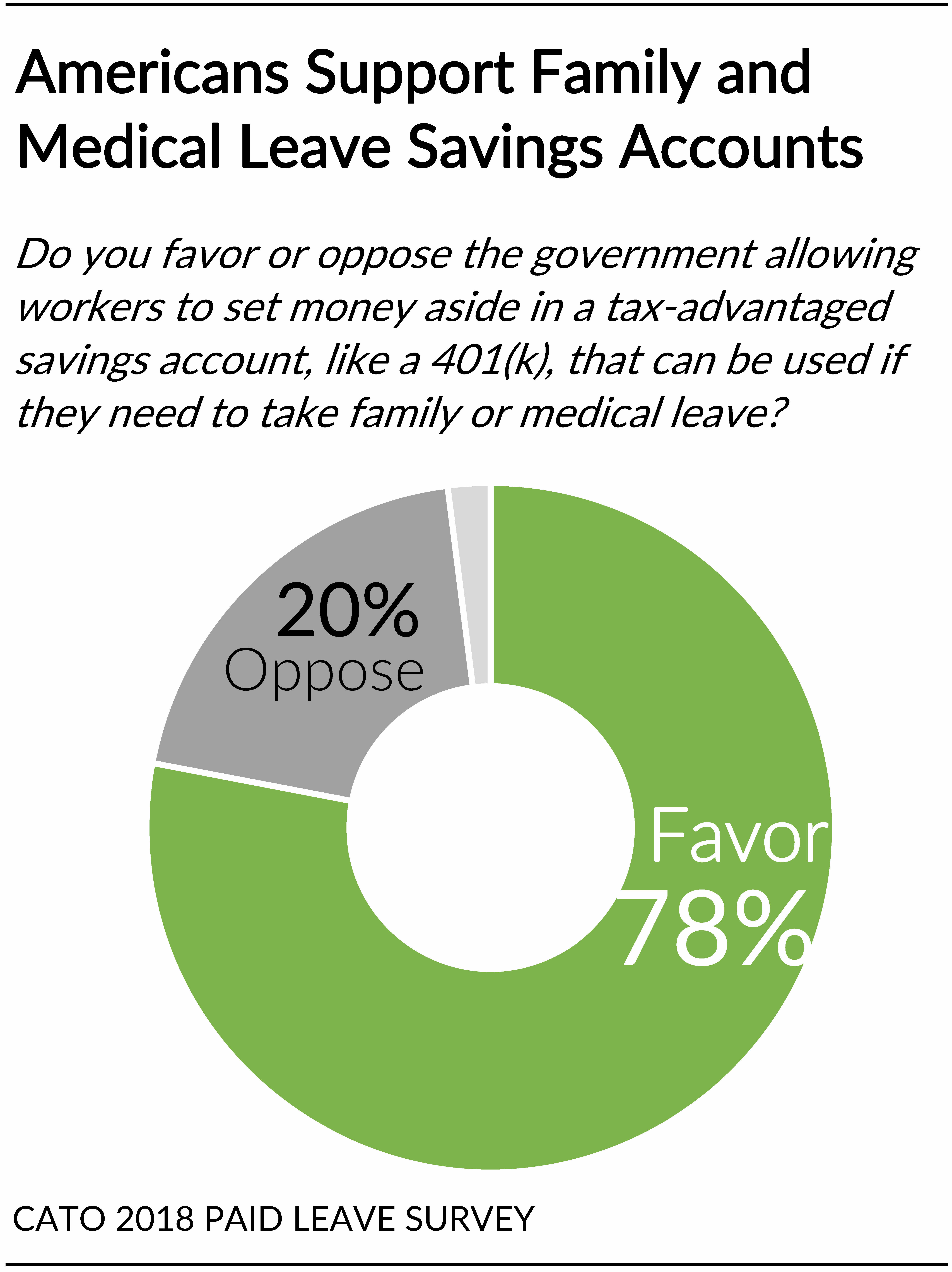 Nearly 8 in 10 Americans (78%) support creating family and medical leave savings accounts. The national Cato 2018 Paid Leave Survey of 1,700 adults finds the public favors allowing workers to set aside money in tax-advantaged savings accounts that could be used if they need to take family or medical leave. A fifth (20%) would oppose the creation of family and medical leave accounts.