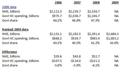 Today, the federal agency that runs Medicare and Medicaid released its estimates of national health expenditures in 2009. Interestingly, the U.S. Centers for Medicare & Medicaid Services re-categorized about 6 percent of national health expenditures — well over $100 billion — from “government” to “private,” at the very moment that the government share of NHE appeared set to hit 50 percent.