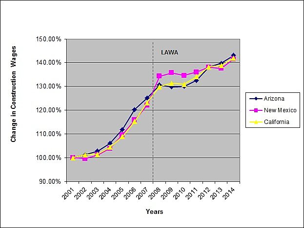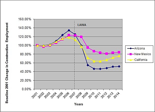Wages for construction workers in Arizona kept pace with wages in surrounding states. They were a little higher in the run up to the housing crisis but quickly fell in 2008 after LAWA became law and only recovered by about 2012 – tracking closely with California which has a much more lenient immigration enforcement policy than Arizona (Chart 2). Neither LAWA nor SB 1070 appear to have improved Arizona wages relative to other states.