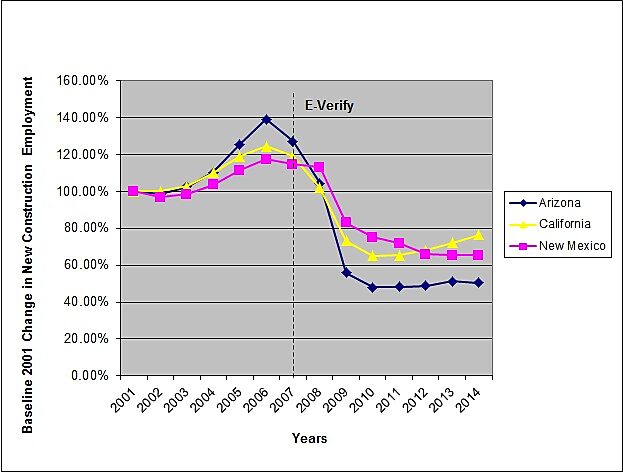 Arizona’s decline in construction employment was steeper and didn’t recover nearly as well as in neighboring states. From July 2007 through December 2014, Arizona employment in construction declined by 45.6 percent compared to 29.5 percent in the neighboring states of New Mexico, Nevada, and California. Nevada is a special case due to its gambling-induced boom and bust cycle. Construction employment in Arizona December 2014 was 49.8 percent below the peak in June 2006, while it was 29.8 percent below the peak in California, and 28.4 percent below in New Mexico. Arizona’s immigration laws aren’t the only factors affecting construction employment, both on the supply and demand sides, but they certainly didn’t improve the situation.