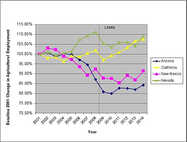 The Arizona’s immigration laws impact on the construction industry is difficult to tease out of the data because their passage coincided with the housing crisis and the Great Recession. Agriculture, on the other hand, would not be much affected by a housing shock but would be greatly disturbed by an immigration enforcement law – which is what the Chart 5 shows. A small note before proceeding, agriculture is seasonal and 2015 data is available only for the first three quarters so the following charts only go up through the end of 2014. Agricultural employment crashed in Arizona around the time LAWA was passed but actually increased in Nevada and California. New Mexico shows a similar decline.