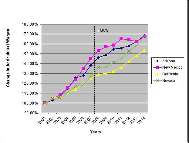 Wages for all agricultural workers grew steadily throughout the whole period but more rapidly before LAWA and SB 1070 became law (Chart 6).