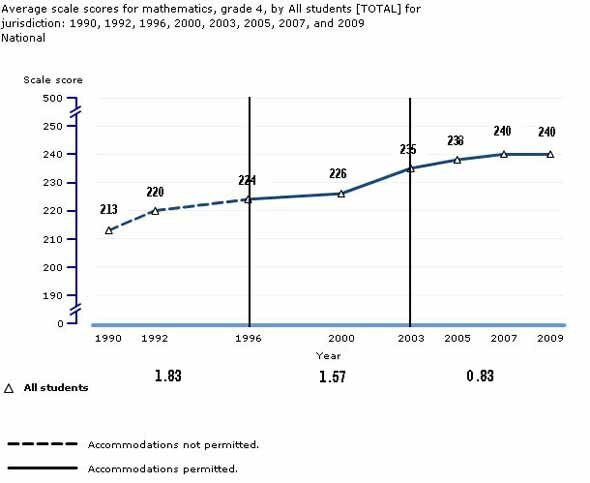 Yesterday, another round of scores on the National Assessment of Educational Progress – the so-called “Nation’s Report Card” — came out. They revealed flattened 4th-grade math achivement between 2007 and 2009, and a two point (out of 500) increase in 8th grade.