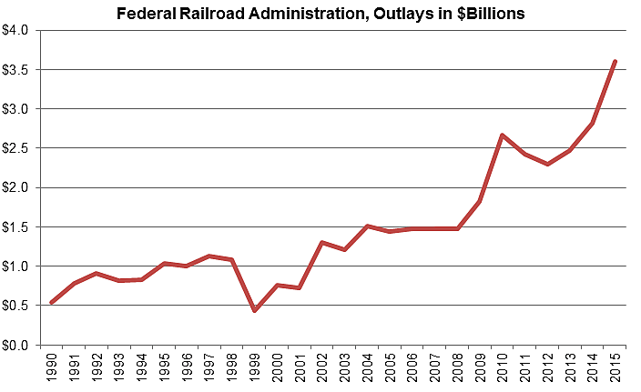 The chart shows total FRA outlays from 1990 to 2015 in current dollars (not adjusting for inflation). Outlays have soared in recent years, partly due to rising high-speed rail spending. During 2009 to 2015, high-speed rail grants were $2 million, $16 million, $304 million, $513 million, $768 million, $1.1 billion, and $1.8 billion. But even aside from that spending, FRA outlays were up modestly over the past decade.