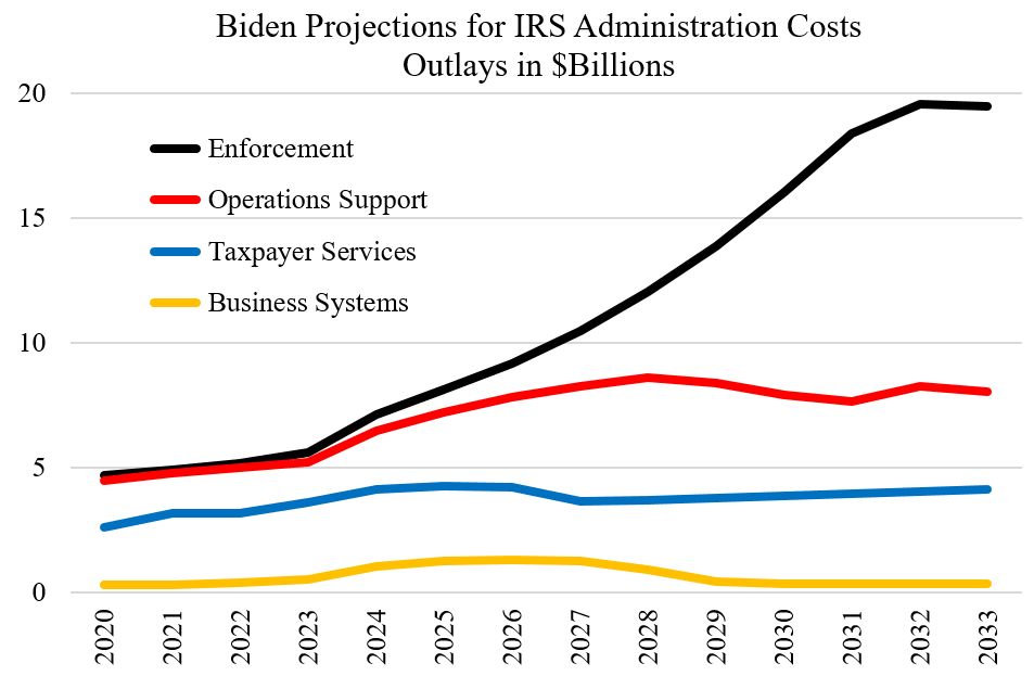 The Biden administration projects that spending on taxpayer services, business systems, and operations support will rise for a number of years then peak and start falling. But enforcement is projected to rocket upwards to 2032 before levelling out.