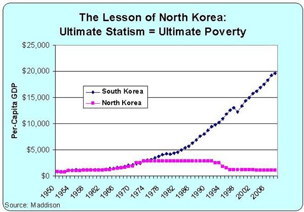 But for a much more dramatic comparison, look at the difference between North Korea and South Korea.