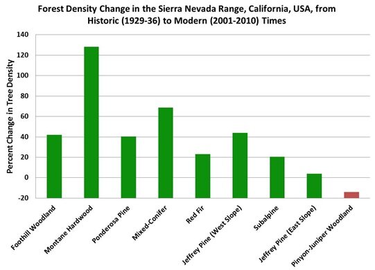 Figure 1. Percent change in tree density by forest type in the Sierra Nevada Range, USA, as determined from historic (1929–1936) and modern (2001–2010) measurements. Green bars denote a statistically significant change. You might want to call this “California Greening.” Source: Dolanc et al. (2014).