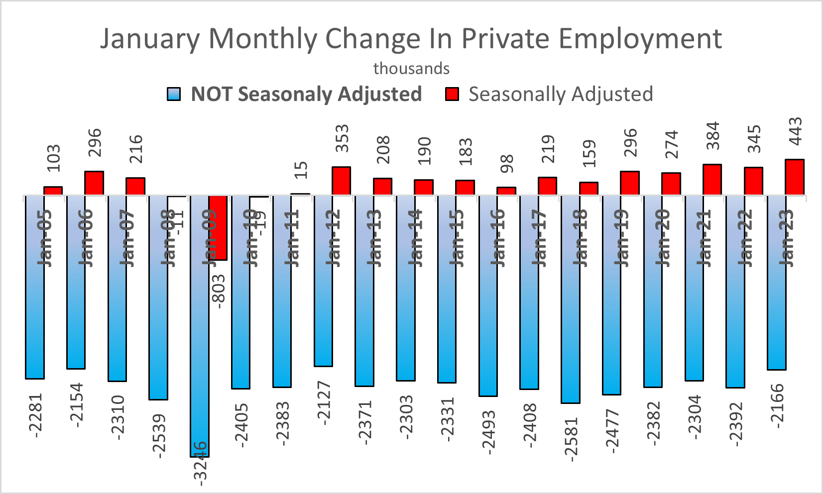 Unless Fed officials believe they must try to shove down the Bureau of Labor Statistics’ seasonal adjustments with higher interest rates, it would be even more foolish than usual for them to treat these preliminary estimates of “seasonally adjusted” job gains as a fearsome omen that falling inflation is about to flare up again in a mysterious burst of spontaneous combustion.
