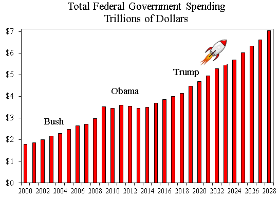 If Congress makes no reforms, federal spending is expected to rise from $4.14 trillion this year to $7.05 trillion by 2028, as shown in the chart. The rise represents an annual average growth rate of 5.5 percent, substantially higher than the 4.0 percent expected nominal growth rate of the economy.