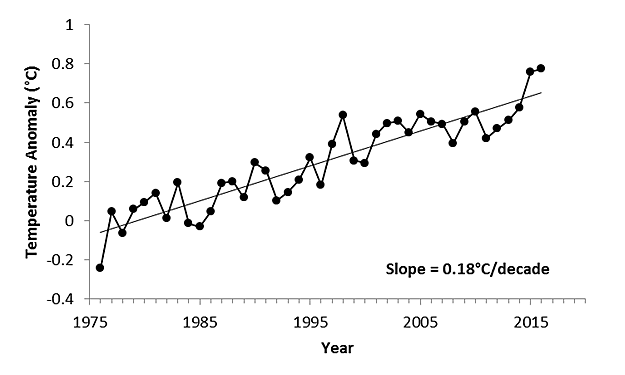 Figure 1. Despite the “pause”, the warming beginning in the late 1970s is remarkably linear, which is a general prediction of climate models. The models simply overestimated the rate of increase.