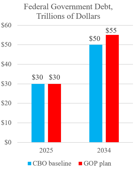 The House plan has a net tax cut of about $6 trillion over 10 years, including interest costs and assuming temporary breaks become permanent. And it has net spending cuts of somewhat more than $1 trillion with interest savings. If that is the final package, federal debt held by the public will soar from $30 trillion this year to about $55 trillion by 2034—$5 trillion more than under the baseline.