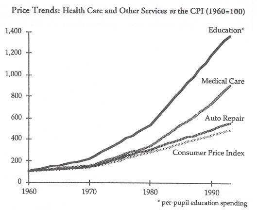 [I]ncreases in the price of what the federal government buys relative to what the private sector buys will inevitably raise the cost of state involvement in the economy. Since the early 1980s the price of hospital care and higher education has risen fivefold relative to the price of cars and clothing, and more than a hundredfold relative to the price of televisions.