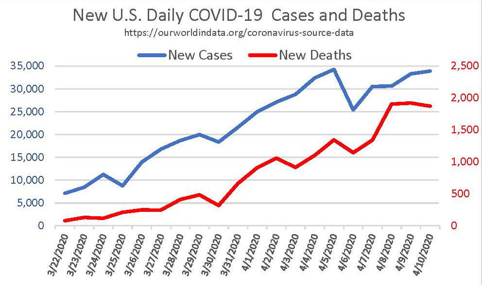 To switch the focus from these familiar multi-month totals to what is happening now, however, I built this simple graph of daily new deaths and daily new confirmed cases. It does suggest recent flattening, though professional optimism about reaching a peak is partly based on key states rather than national totals.