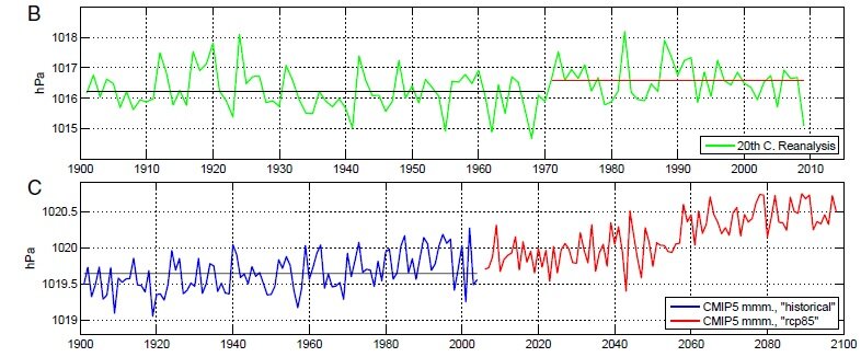 An analysis in the new headline-generating paper by Colin Kelley and colleagues that just appeared in the Proceeding of the National Academy of Sciences shows the observed trend in the sea level pressure across the eastern Mediterranean as well as the trend projected to have taken place there by a collection of climate models. We reproduce this graphic as Figure 1. If the subtropical high is expanding northward over the region, the sea level pressure ought to be on the rise. Indeed, the climate models (bottom panel) project a rise in the surface pressure over the 20th century (blue portion of the curve) and predict even more of a rise into the future (red portion of the curve). However, the observations (top panel, green line) do not corroborate the model hypothesis under the normative rules of science. Ignoring the confusing horizontal lines included by the authors, several things are obvious. First, the level of natural variability is such that no overall trend is readily apparent.