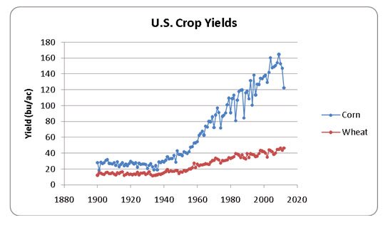 Figure 1. U.S. national corn and wheat yields, 1900–2012 (source: USDA National Agricultural Statistics Service).
