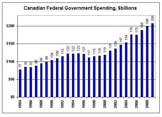 Canadian spending did grow during the past decade, but much less than U.S. government spending. Between 2000 and 2009, total Canadian federal spending increased 47 percent, but total U.S. federal spending rose 97 percent.