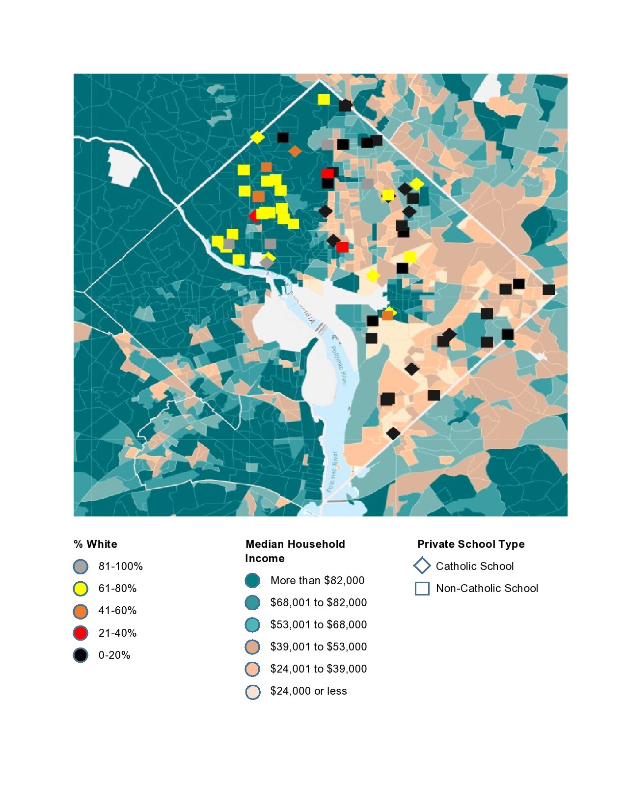 Contrary to what many people likely imagine, DC’s private schooling sector is not lily white: private schools serve all sorts of kids. Breaking down the city’s 63 private elementary and secondary schools using National Center for Education Statistics and GreatSchools.org data indicates that almost half—31 schools—serve predominantly minority student bodies, defined as more than 50 percent black and Hispanic. Roman Catholic schools—which have traditions of serving first dispossessed Catholics, then other poor and marginalized groups—disproportionately serve such populations, with 58 percent of Catholic schools doing so. Catholic schools, especially diocesan institutions, also tend to be less expensive than non-Catholic schools, making them more affordable to African Americans and Hispanics, who tend to have lower incomes.
