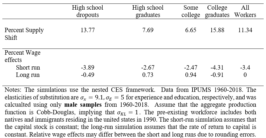 Table 1 shows our results for how immigration affected the relative wages of workers. There was a 15.88 percent increase in the supply of college-educated immigrants between 1990 and 2018, measured by their increase in relative work hours. The increase during this period caused the wages of native-born workers to fall by a relative 4.31 percent on average in the short-run. However, the long-run impact is trivial; a 15.88 percent increase in highly skilled immigrants only caused a 0.9 percent relative decline in wages. The long-run impact takes account of the adjustments in the rest of the U.S. economy in response to immigration, mainly how the capital stock grows. The long-run impact is what matters for judging the impact of immigration on the United States.