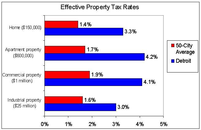 A study by the Lincoln Institute of Land Policy looked at effective property tax rates in the 50 largest U.S. cities in 2011. Detroit had the highest property tax rates of all 50 cities on homes, apartment buildings, commercial buildings, and industrial buildings.