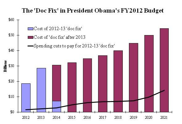Back in 1997, Congress enacted automatic reductions in the price controls that Medicare uses to pay for physician services. Congress has delayed those cuts year after year, and everyone now agrees they are politically infeasible. We’re not talking about your the usual, Washington-DC definition of spending cuts here, which is just a reduction in spending growth. If the accumulated cuts were to take effect in 2012, as provided by current law, Medicare payments to physicians would fall by some 25 percent, and lots of seniors would find their doctor no longer accepts their Medicare coverage. The problem is, these cuts are still on the books and they grow larger every time Congress delays them. But no one wants to come up with the money needed to pay for a permanent “doc fix.”