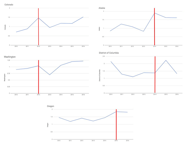 The graphs below depict pedestrian fatalities for states that legalized recreations marijuana between 2012 and 2016. The red lines represents the year in which the state legalized. The graphs suggest no relation between legalization and pedestrian deaths.
