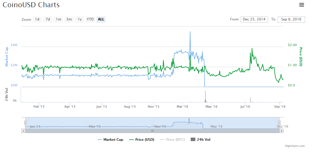 CoinoUSD, which began trading in December 2014, was developed by a for-profit payments firm called Coinomat and built on the blockchain of the NXT cryptocurrency. (In November 2014 NXT was the #6 cryptocurrency with a market cap of $19 million; currently it ranks #38 with a market cap around $13 million.) CoinoUSD reached a market cap plateau of $2.7 million in early 2016, but shut down in early 2016, due to a “payout glitch” that flooded customers with free CoinoUSD units, making it impossible to maintain the exchange value at $1. Coinomat announced a reboot in which the erroneous payout would be reversed and said, “NXTUSD will replace CoinoUSD completely, and enhance it,” but this appears not to have happened. Since then it has had a market cap of zero, and its webpage at the Coinomat site declares it “disabled until further notice.”