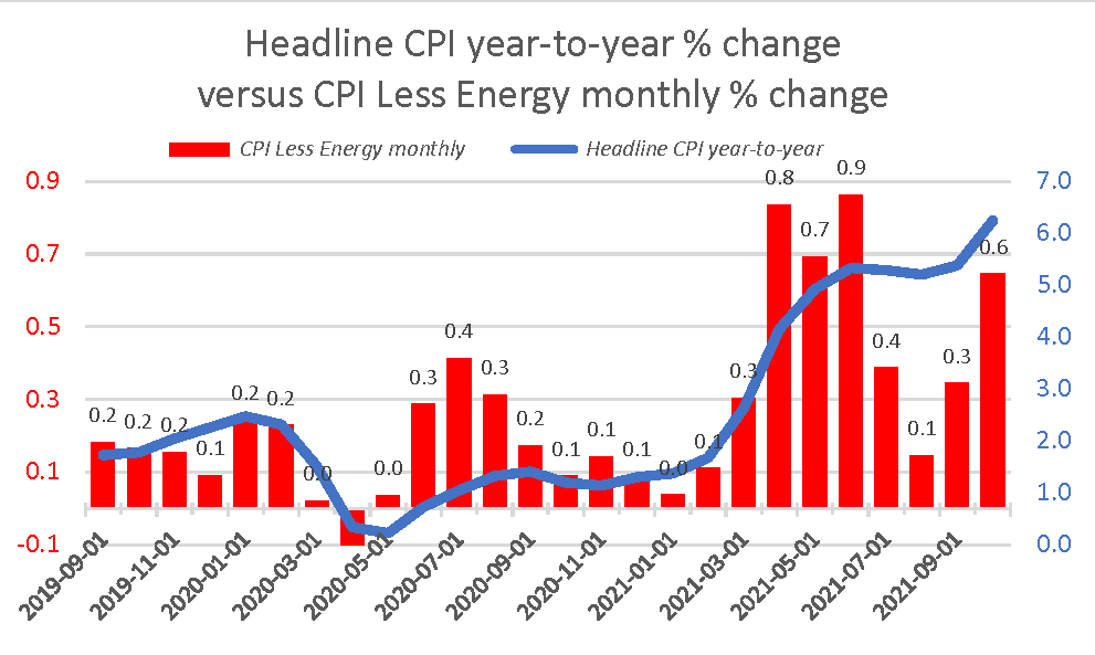 This graph compares the year-to-year percentage change in headline inflation (the blue line) with the monthly percentage change in the consumer price index (CPI) excluding energy (the red bars). Because the blue line has exceeded 5% since June and exceeded 6% in October, many are understandably convinced that inflation was lower in the spring and has accelerated since then.