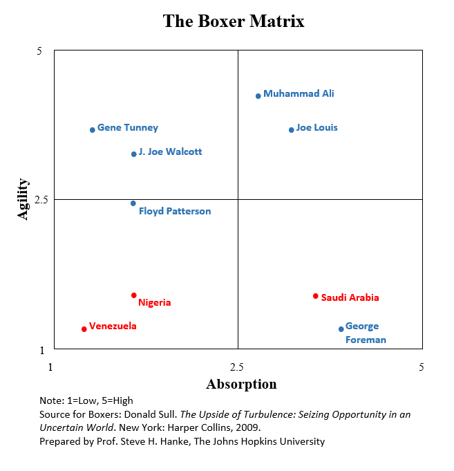This brings us to Ali’s message on economics, with particular reference to countries that are heavily dependent on the production of oil. In turbulent times (read: oil price plunges), countries like Saudi Arabia, Venezuela, and Nigeria experience a great deal of pain because their oil-dependent economies aren’t diversified. In short, they lack agility. This is reflected in their position in the lower half of the Boxer Matrix.