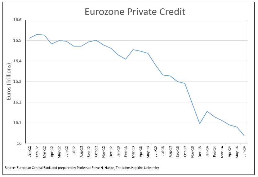 The European Union (EU) is still in the midst of an economic slump. Many members of the political class in Brussels claim that fiscal austerity is to blame. But, this diagnosis is wrong. The EU’s problem is one of monetary, not fiscal, austerity. Money matters. Just look at the accompanying chart. Private credit in the Eurozone has been shrinking since March 2012.