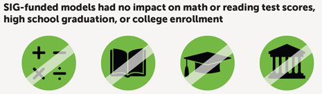 The first is a new report on the School Improvement Grants program, an initiative aimed at turning around troubled schools with various possible interventions ranging from replacing principals to closing schools. What did the report find? The multi-billion dollar undertaking “had no impact on math or reading test scores, high school graduation, or college enrollment.”